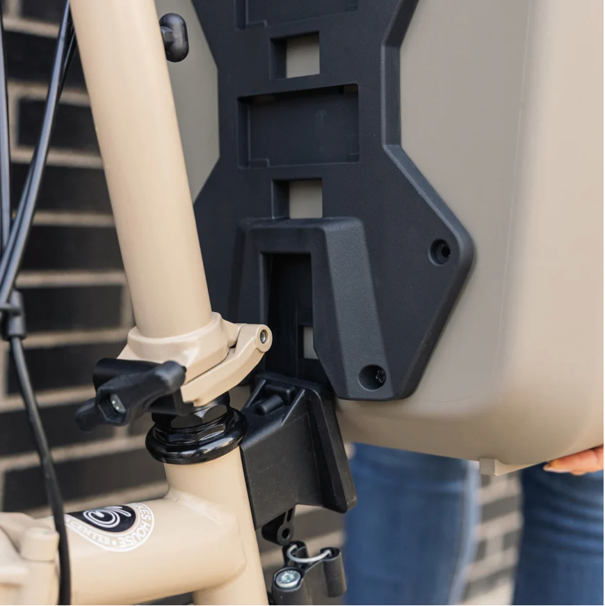 La sacoche s’adapte parfaitement au support avant des vélos Brompton grâce à son ancrage exclusif. Ce système permet une installation simple et sécurisée sans compromettre la maniabilité du vélo. Grâce à son design frontal équilibré, le poids reste centré pour préserver le confort de conduite.
